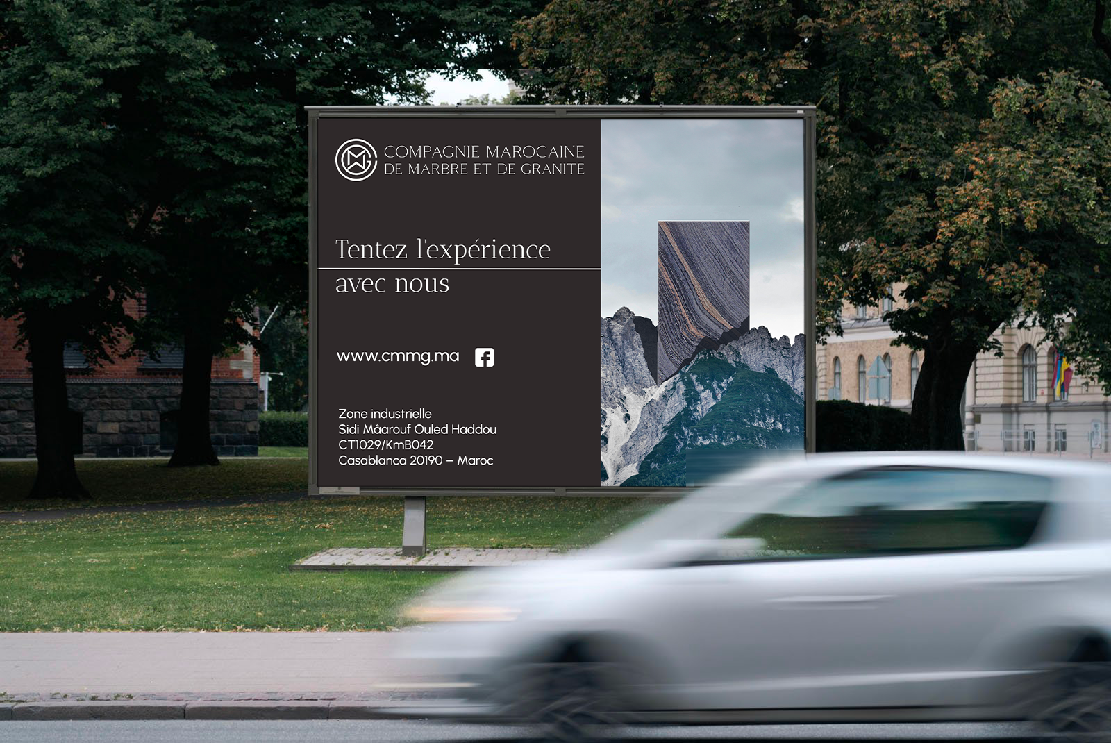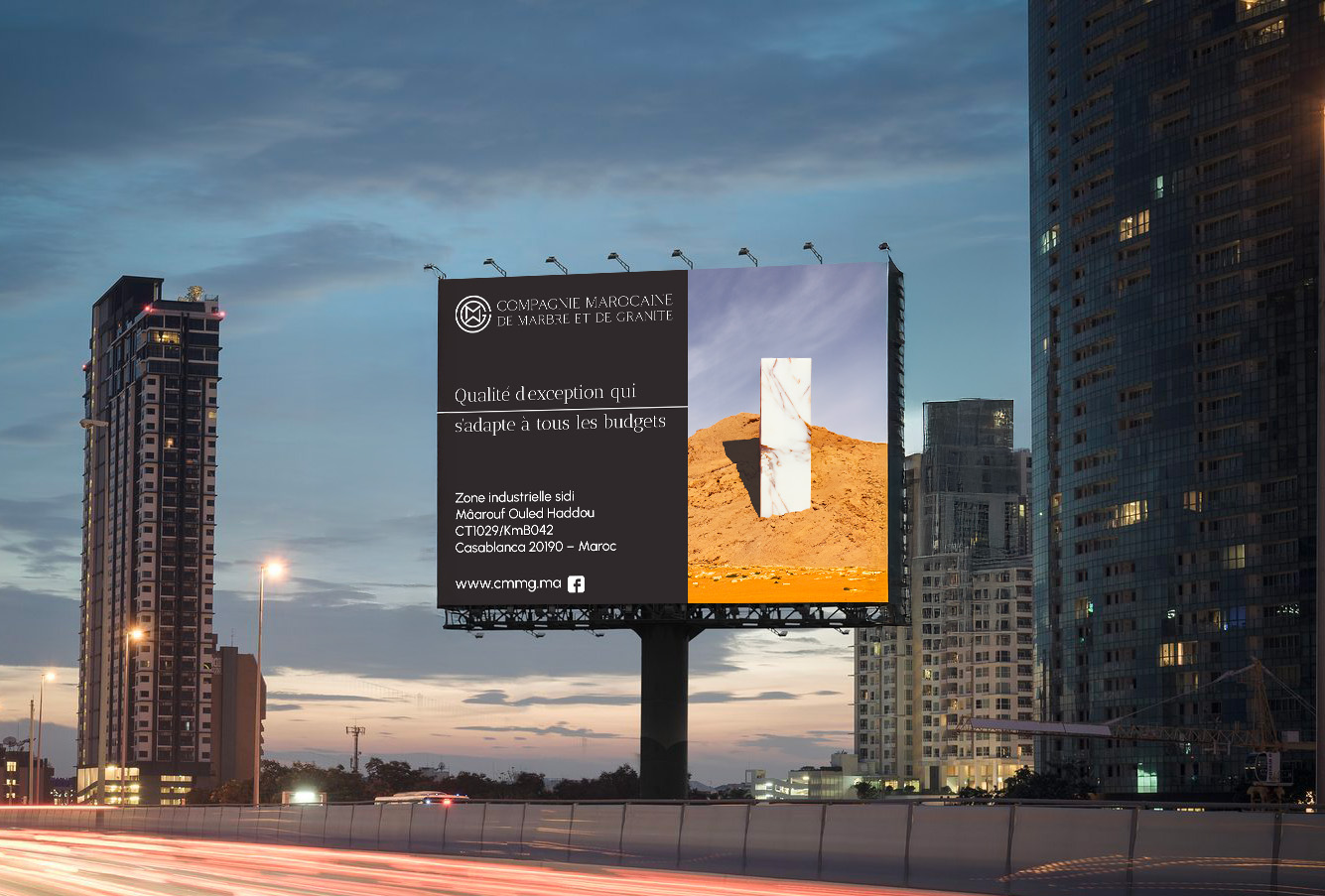 Panneaux publicitaires C.M.M.G. Compagnie Marocaine de Marbre et de Granite, entreprise basée à Casablanca Description: Réalisation de plusieurs panneaux publicitaires grand-format type billboard, en vue d’une installation aux abords d’un axe routier. Année de réalisation: 2024 Projets similaires ↯ Identité visuelle ESAC saison 2025 Identité visuelle Aby et Dan Identité visuelle Pia Energy Identité visuelle Maison Suzon Autres Exposition “Dialogues, Quand l’objet sort du cadre” Supports imprimés Dark Black Typeface