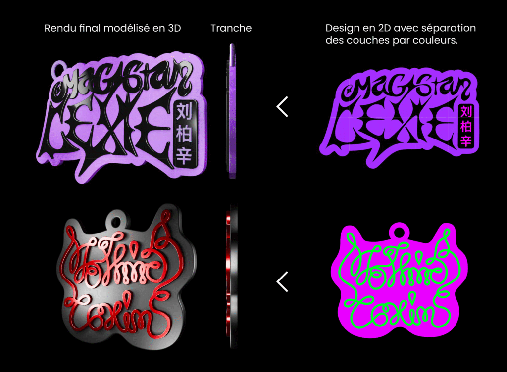 Réalisation de lettrages graphiques finalement imprimés en 3D sous forme de porte-clefs.
